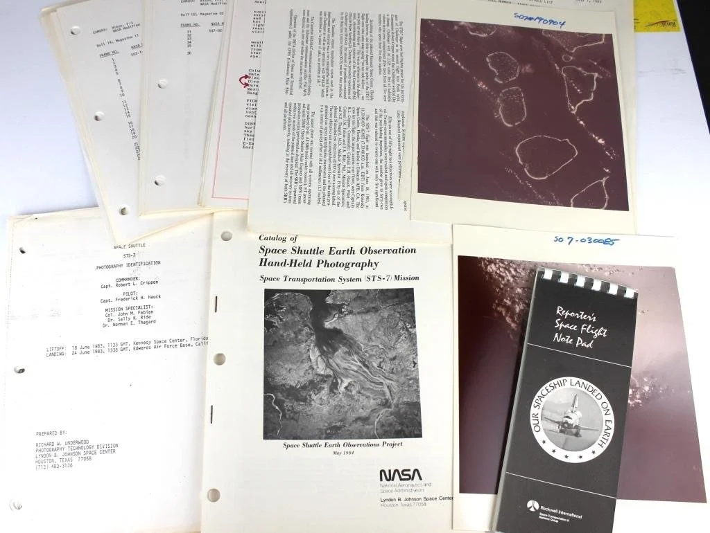 My recent winnings from Lunar Legacies include a map of planned and actual impact sites for Apollo 15 and a large lot of collectibles from Sally Ride’s historic flight, STS-7. I joined NASA a few weeks beforehand, so this takes me back to the earliest days of my career. I’m highlighting space “firsts” on my site, and she was an important one, the first American woman in space.
