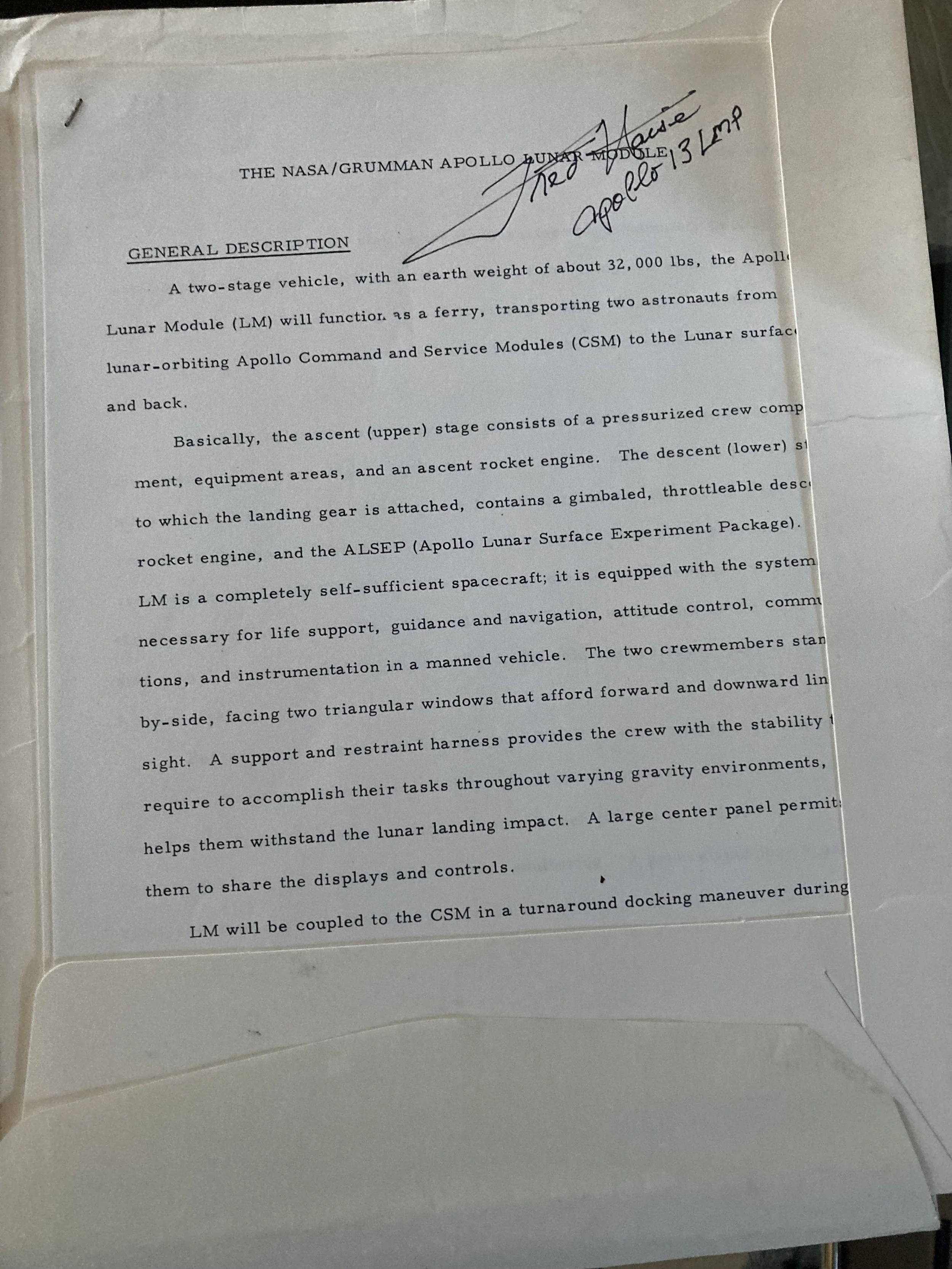Lunar Module Document Signed by Apollo 13 Astronaut Fred Haise
