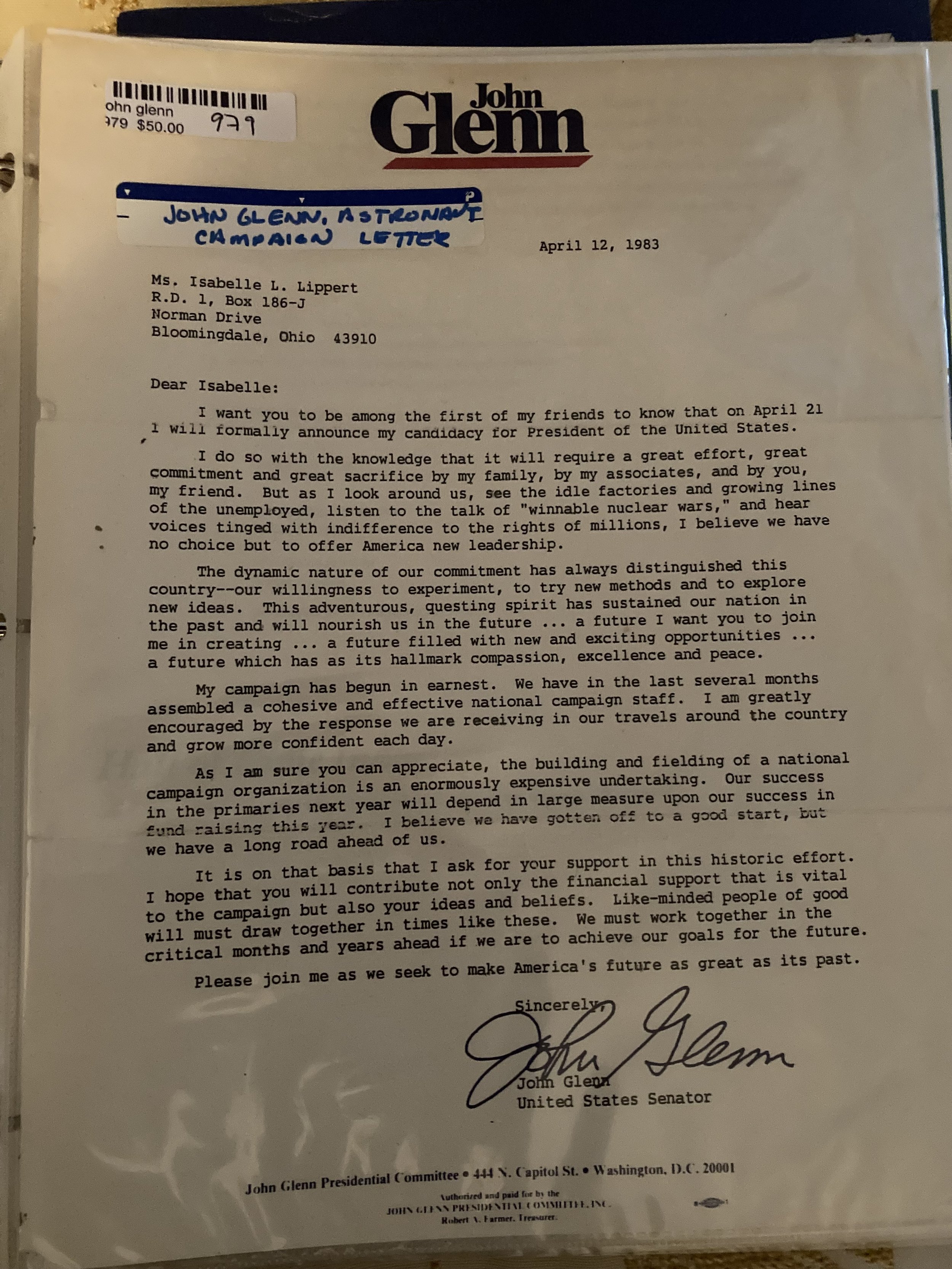 Mercury Astronaut John Glenn Campaign Letter